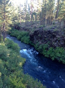 As I walk the path of the river in search of a nice deep pool to throw my streamer (courtesy of Fly Fisher’s Place fly shop in Sisters, OR); I am lost in the gorgeous surroundings. Trees and meadows with a hint of snow capped mountains in the background, deep pools surrounded by jutting canyons. Gorgeous. This first day, I am fishing just downstream from Camp Sherman in the riffles, pools and undercuts.  And both Dad and I get skunked. Not what I had in mind.